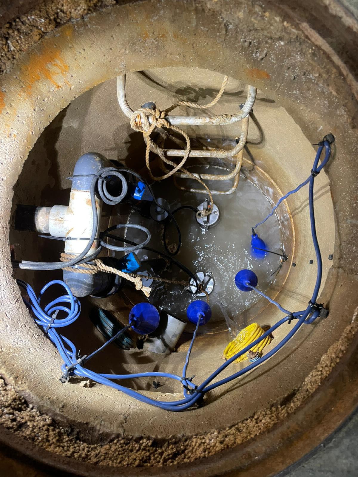 Suite à cela , nos techniciens ont remplacé les deux pompes de relevage ainsi que leurs panoplies de refoulement. Les pompes étaient en suspension , maintenues par le PVC pression ce qui représentait un risque de casse et de panne importante.
