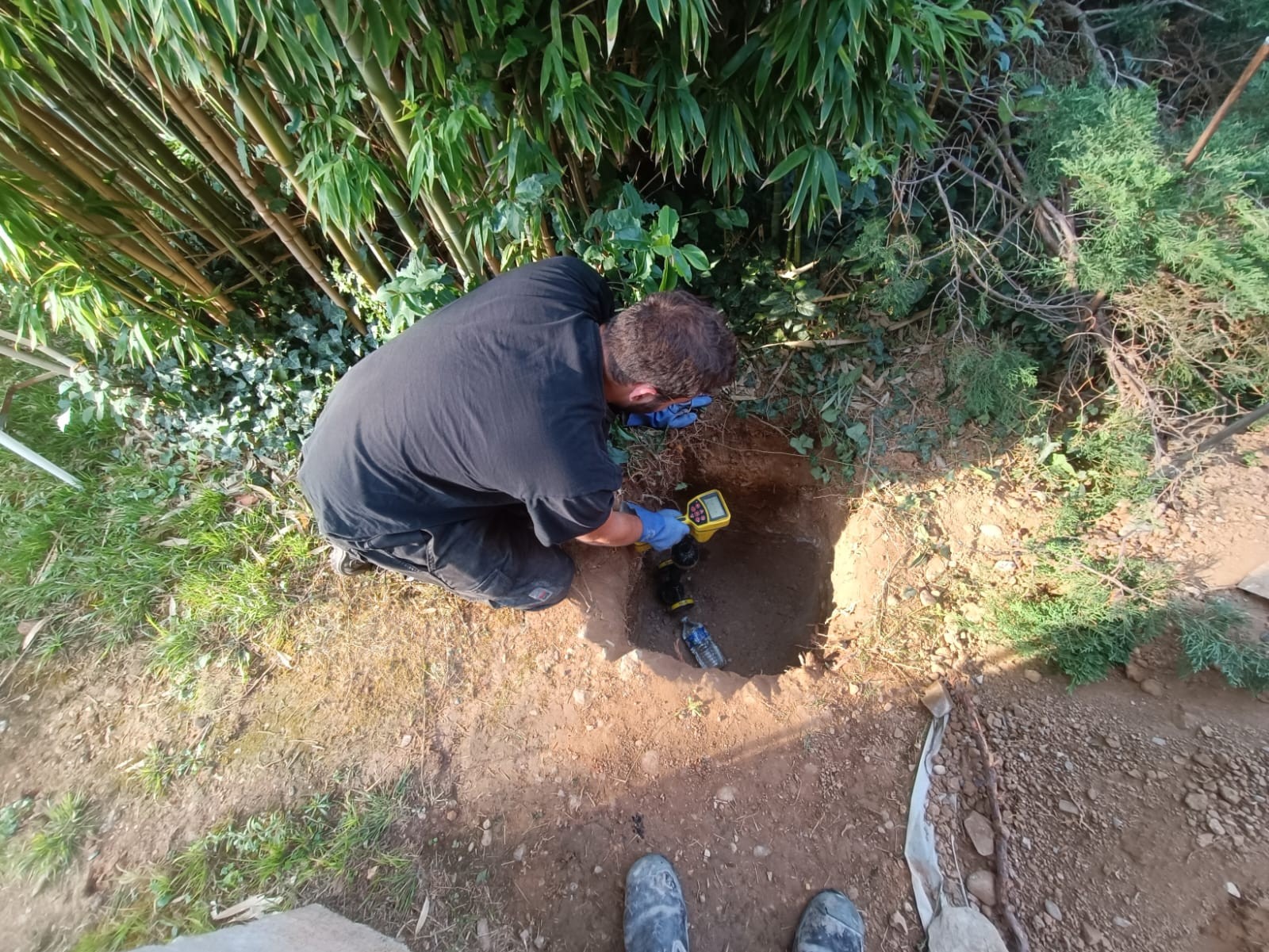 Après une localisation par caméra et émetteur récepteur de la canalisation , nos techniciens ont réalisé un terrassement manuel jusqu'à la découverte de la canalisation.